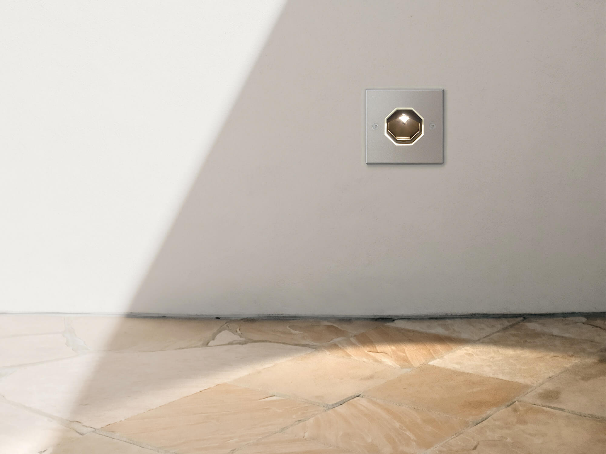 Escalier mural en acier inoxydable et marqueur d'extérieur. Design unique donné par les masques octogonaux à l'intérieur du corps de la lampe.